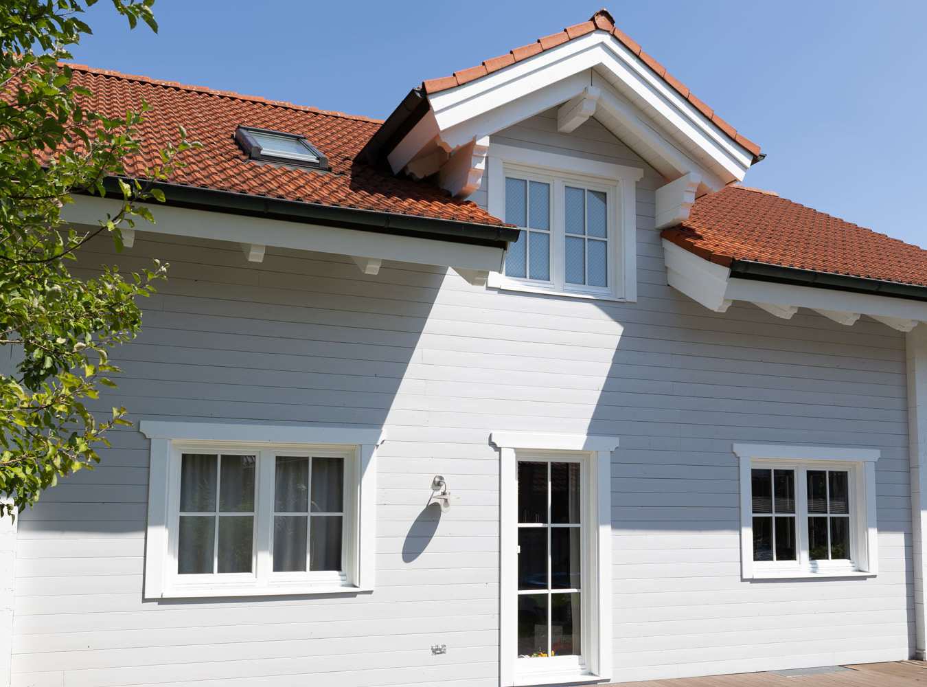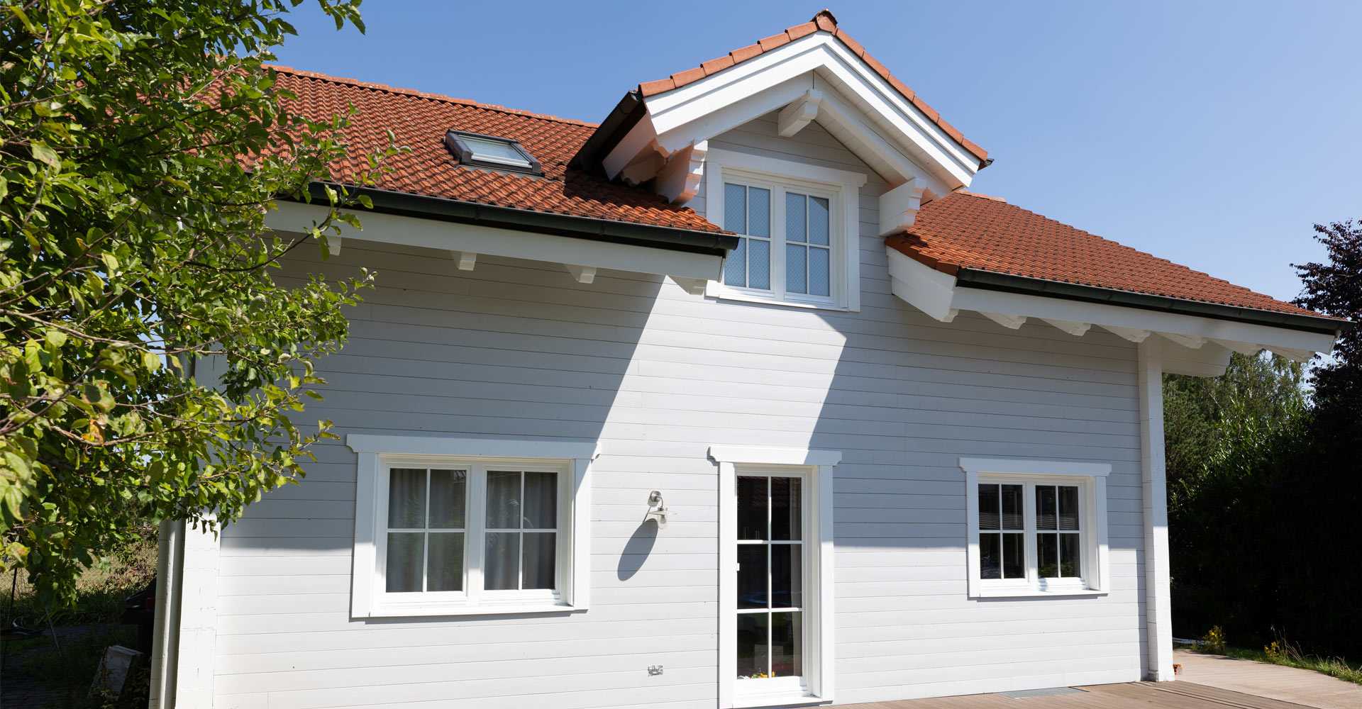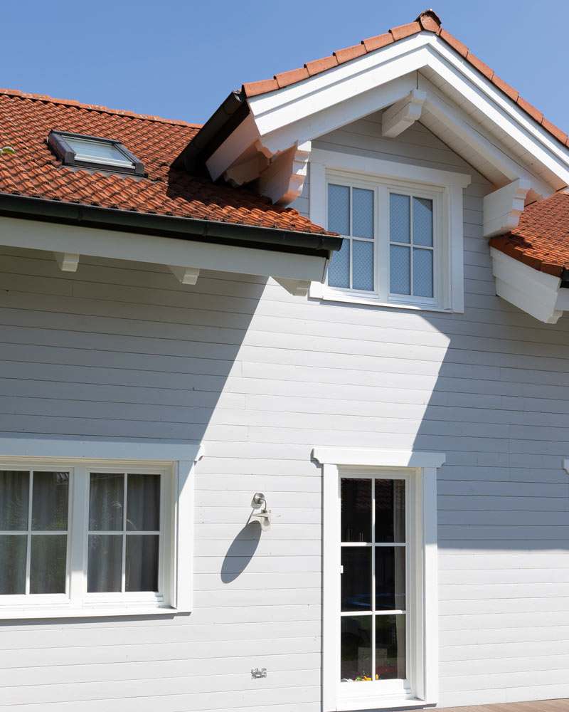 Neue Fenster und Fassadenschalung auf 2 Hausseiten. Die Fassadenschalung wurde hier zwischen die bestehenden Vorköpfe der Blockwand eingefügt.